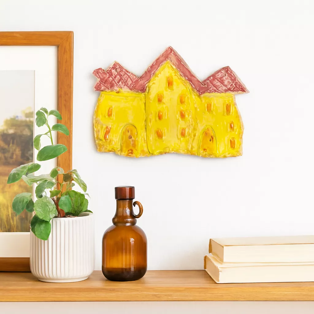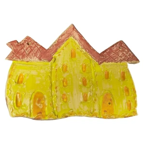 Ręcznie wykonana ceramiczna zawieszka przedstawiająca stylizowaną kamienicę z trzema szczytowymi dachami. Idealna jako dekoracja ścienna do wnętrz w stylu rustykalnym, artystycznym lub dziecięcym.