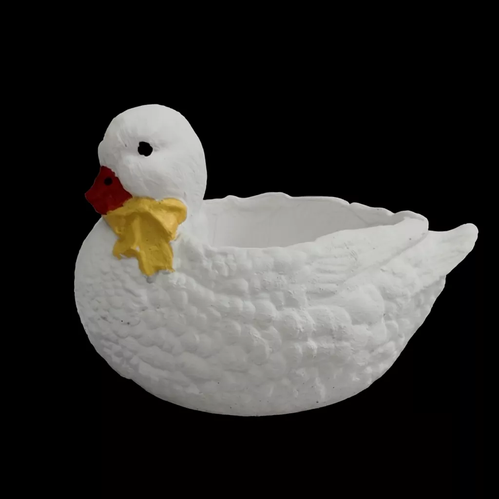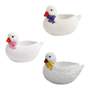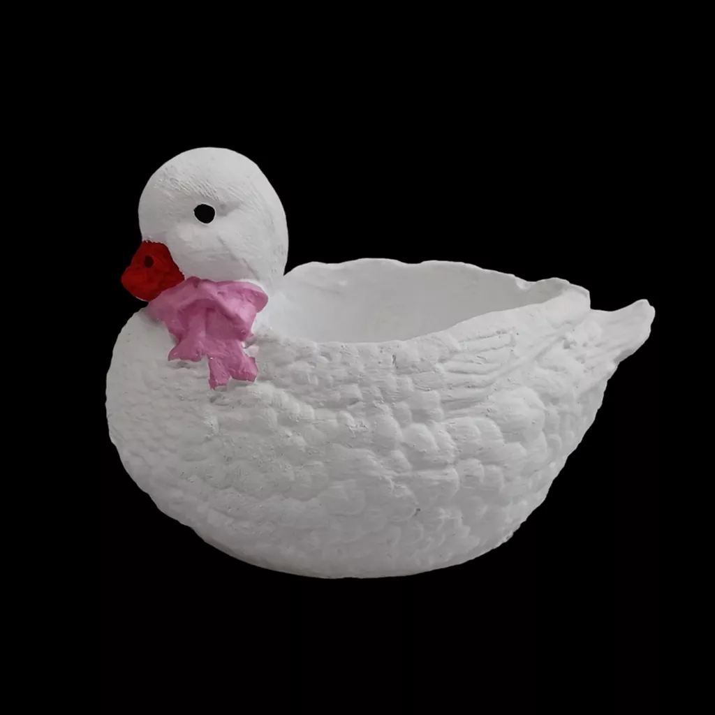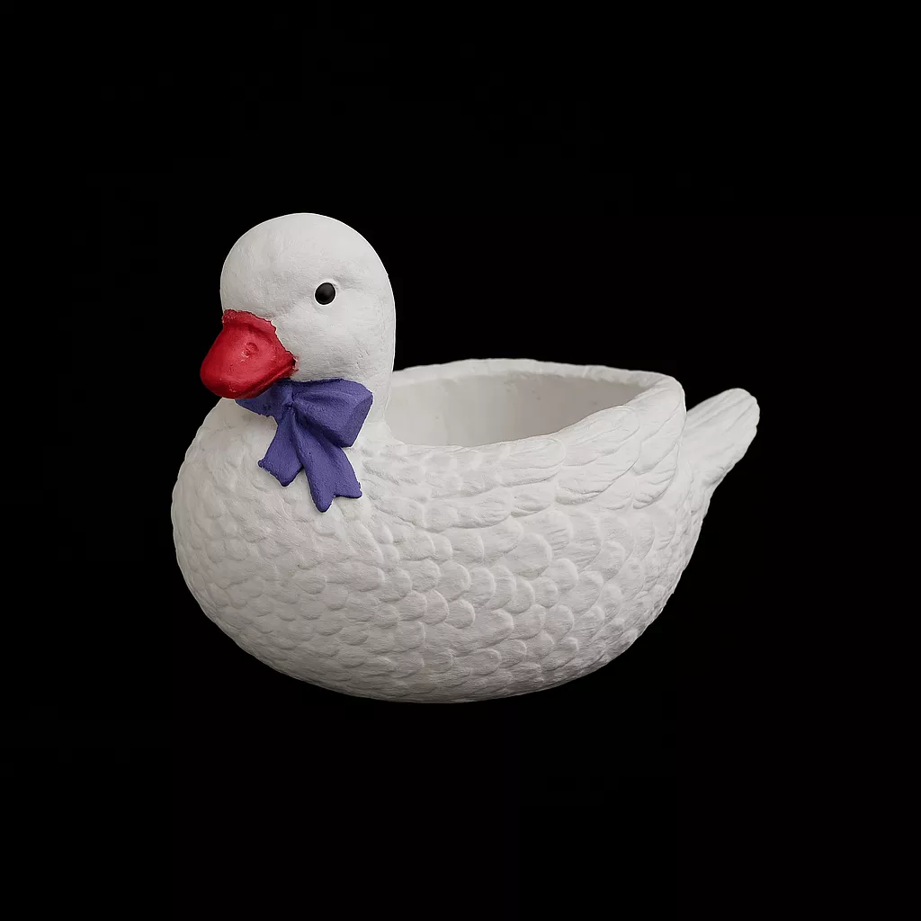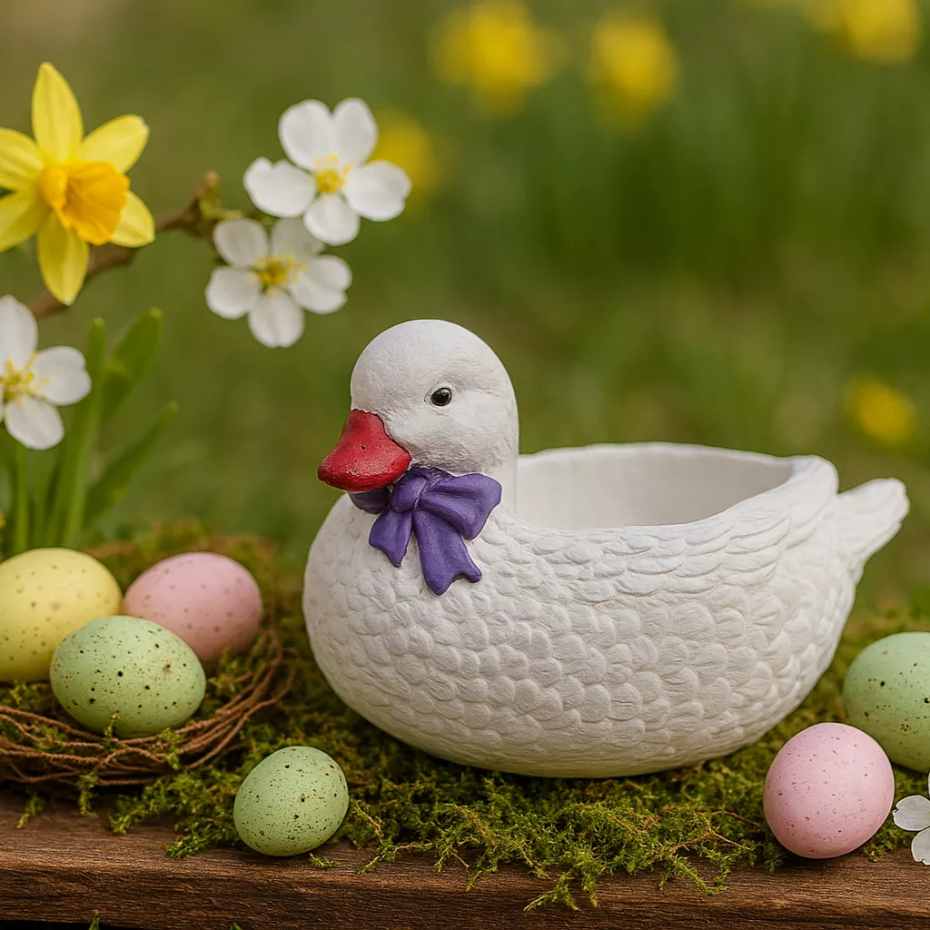 Urocza gipsowa kaczka ręcznie malowana z kokardką w trzech wariantach kolorystycznych – żółtym, fioletowym lub różowym. Idealna jako dekoracja domu, prezent lub element sesji zdjęciowych.
